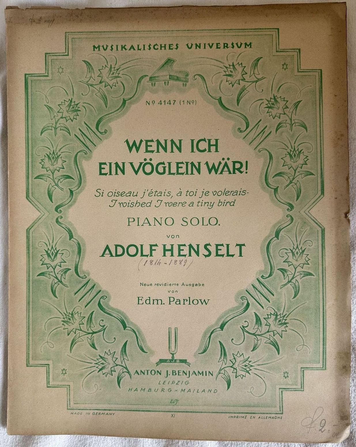 Edizione del 1924 della melodia "Wenn ich ein voglein war" del compositore tedesco Adolf von Henselt (1814-1889). In buone condizioni. Copertina editoriale in buone condizioni con lievi usure marginali. Legatura editorialmente assente. Pagine in ottime condizioni con rare fioriture. In folio. cm. 34x27. Pp. 5.Edition of 1924 circa of the melody "Wenn ich ein voglein war" by the german composer Adolf von Henselt (1814-1889). In good conditions. Editorial cover in good conditions lightly worn in the extremities. Binding editoriarly lakcs. Pages in very good conditions with occasional foxing. In folio. cm. 34x27. Pp. 5.