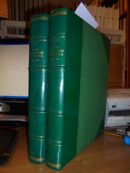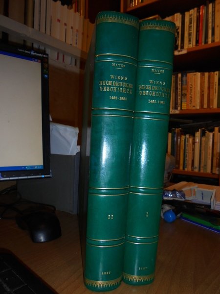 ANTON, MAYER. Vienna, zur Feier der Vierhundertj, 1883/1887. WIENS BUCHDRUCKER-GESCHICHTE 1482-1882. 2 volumi in-folio, m. pelle verde con grandi angoli, dorsi a nervi con titoli e fregi in oro. I. xvi, 404 pp., antiporta a colori ed un ritratto f.t.; II. viii, 427 pp., 25 tavole in nero e a colori f.t., 1 ritratto intercalato n.t. Bellissimo esemplare. Uff. E - I - 6