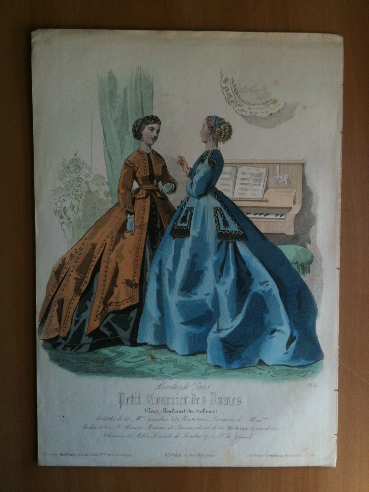 Xilografia acquerellataestratta da "Petit Courrier des Dames"Paris - Boulevart des Italiens n^ 1Toilettes de la maison Gagelin 83 r. Richelieumisure 18,5x27,5 cmE 1586