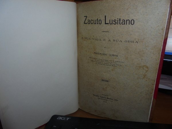 Por Maximiano, Lemos. Porto, Eduardo Tavares Martins Editor, 1909. ZACUTO LUSITANO a sua Vida e a sua Obra. In-8°, m. pelle avana con larghe punte, dorso a nervi con titolo e fregi in oro, copertine originali conservate. 398 pp. con gravuras nel testo. Bell' esemplare in pregiata legatura. Uff. C - III - 6 - 2