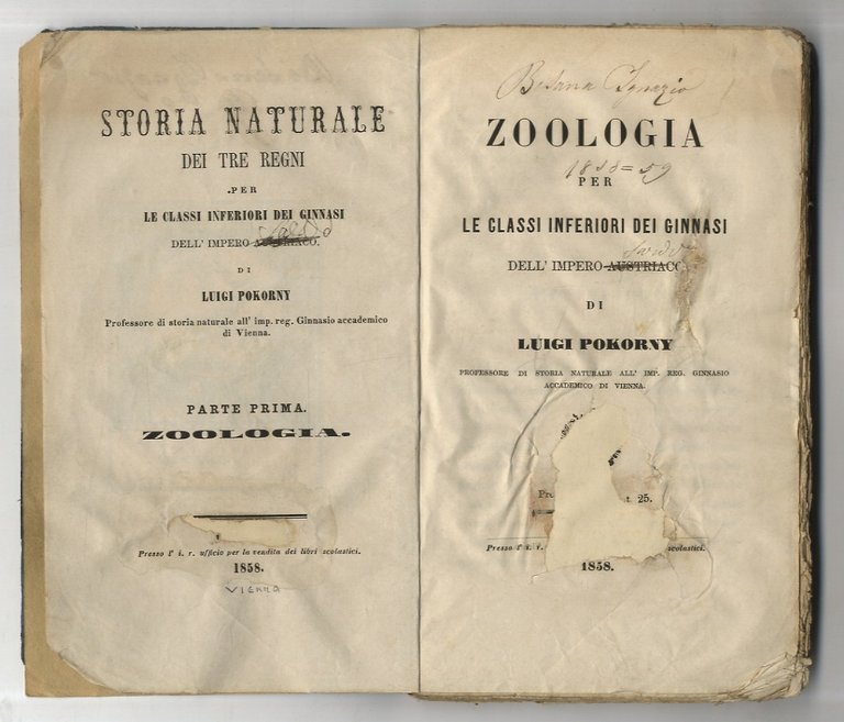 Vienna, presso l'I.R. ufficio per la vendita dei libri scolastici, 1858, in-8, br. editoriale azzurra, pp. VIII, 221, (3). Dorso rifatto e copp. controfondate, con tracce d'uso. Mancanze reintegrate a occhietto e frontespizio. Firma d'appartenenza manoscritta: Ignazio Besana, 1858-59, che ha biffato l'"austriaco" del titolo scrivendo "sardo"; nel 1814-58 il Regno Lombardo-Veneto (nelle cui scuole questo era libro di testo) era parte dell'Impero austriaco, ma dal 1859, dopo la 2a guerra d'indipendenza, fu annesso al Regno di Sardegna.