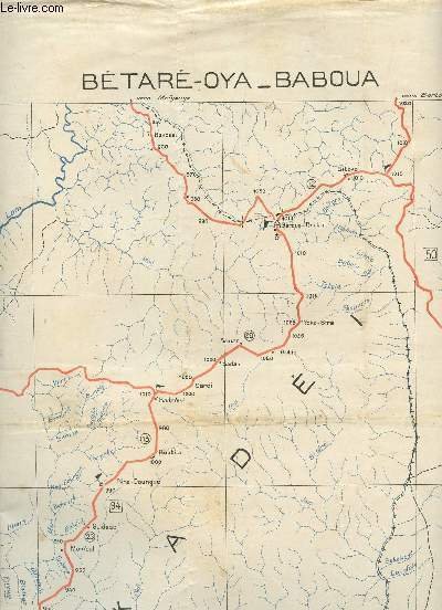 1950. In-Plano. En feuillets. Etat d'usage, Couv. convenable, Dos satisfaisant, Int�rieur frais. 1 CARTE DEPLIANTE EN COULEUR DE BETARE-OYA-BABOUA - N'GAOUNDERE (CROQUIS PROVISOIRE - S.G. A.E.F. CAMEROUN) - NB 33 IX - / DE DIMENSION 60 Cm X 70 Cm - Echelle 1/120000e. . . . Classification Dewey : 912-Atlas, cartes et plans
