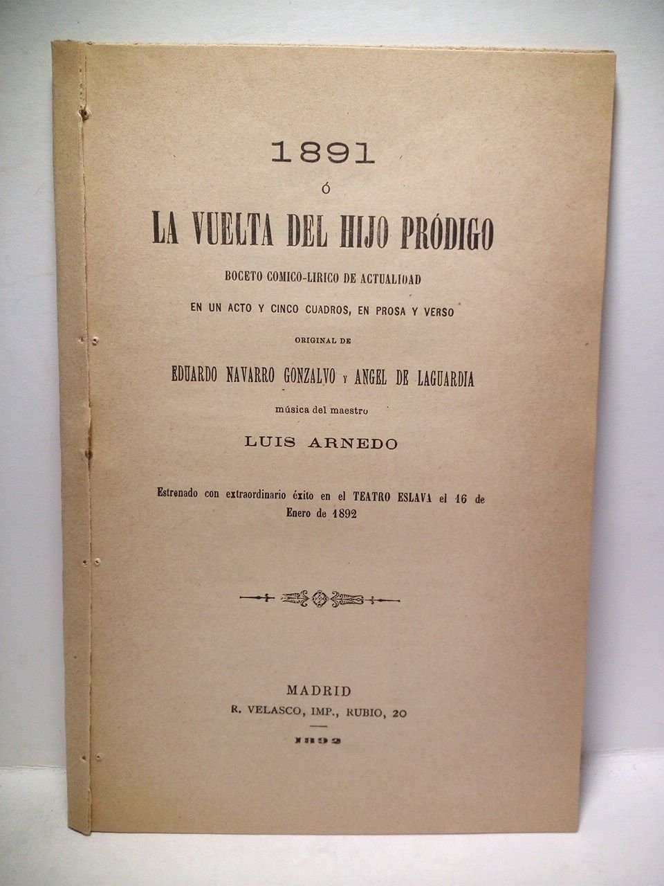 1891 o la vuelta del hijo pródigo. (Boceto cómico-lírico de actualidad en un acto y cinco cuadros, en prosa y verso. Estrenado con extraordinario éxito en el Teatro Eslava el 16 de Enero de 1892) / Música del maestro Luis Arnedo | Libri antichi e moderni | Navarro Gonzalvo, Eduardo Y Angel De Laguardia