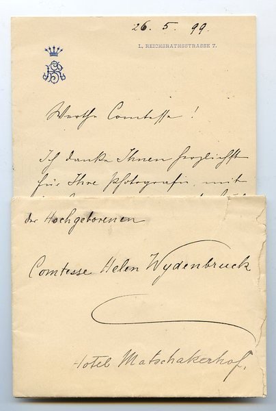 (Large) 8vo. Altogether (1¼+1½ =) 2¾ pp. on 2 ff. With 1 autogr. envelope. Sending Comtesse Helen Wydenbruck a portrait photograph of himself. - One letter on stationery with blindstamped vignette.