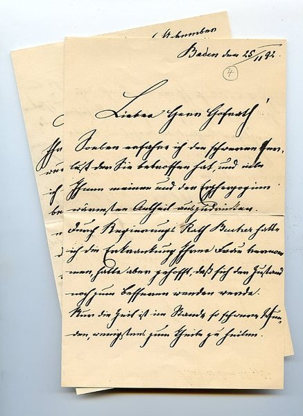 Zusammen (1½+2½ =) 4 SS. auf 4 (= 2 Doppel-)Blatt. Gr.-8vo. Jeweils mit eh. adr. Kuvert. An den Kunsthistoriker Jakob von Falke (1825-97), den Direktor des Österreichischen Museums für Kunst und Industrie (heute das Museum für angewandte Kunst), dem er zum Ableben von dessen Gattin kondoliert (Br. v. 25. XI. 1892) und betr. dessen Pensionierung: "[.] Durch volle 30 Jahre, von der Gründung dieser Anstalt, bis zum heutigen Tage, an der Leitung derselben mitbetheiligt, und durch eine Reihe von Jahren dieselbe selbstständig leitend, haben Sie in dieser Stellung hervorragende Erfolge erzielt. Meiner Ansicht nach wurde das Museum während dieser Zeit stets in der richtigen ursprünglich gedachten Bahn erhalten, durch enge Verbindung mit der Schule und dem Kunstgewerbe, der Kunstindustrie die Wege zu weisen, welche dieselben zu befolgen haben. Wie ich hoffe, wird auch in Zukunft unsere Anstalt ihren Platz voll ausfüllen [.]". - Tls. mit kleinen Randläsuren.
