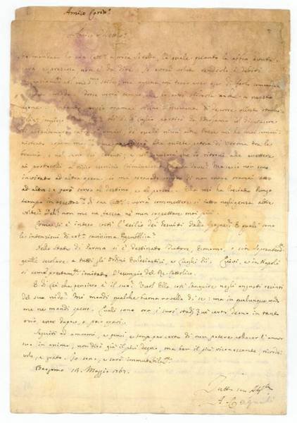 Zusammen (1+2 =) 3 SS. auf 4 Bll. Jeweils mit eh. Adresse (Faltbriefe). In italienischer Sprache an Eusebio della Lena in Lucca, u. a. mit der Bitte um Auskunft nach den Absichten der venezianischen Regierung hinsichtlich der aus Spanien ausgewiesenen Jesuiten (Br. v. 13. V. 1767). - Mit kleinen Randläsuren und starken Wasserschäden.