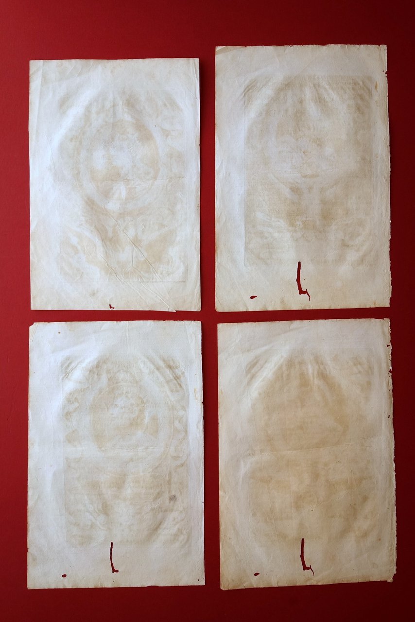Quattro incisioni originali, Quattro incisioni originali Re Longobardi Ragumberto - Cuniperto - Ariperto - Bertarito Miele del. - De Pienne sc. cavati dal museo del Marchese Belisoni in Pavia fine '600 circa S. d. (fine '600 circa); quattro belle incisioni originali in b/n su carta, di ampio formato, provenienti da antica opera in volume. Retri bianchi. Cm 34x22,5. Condizioni di conservazione Incisioni tutte complessivamente ben conservate con piccoli lievi aloni e bruniture, poche piccole gore; tracce di pieghe centrali di conservazione; margini lievemente rifilati, quelli inferiori con un paio camminamenti da tarlo, di cui tre che interessano in misura pressoché trascurabile l'illustrazione (vedi foto). Ritratto del sovrano Ariperto lievemente abraso in corrispondenza del volto del monarca (vedi foto). SC03.D16196 N F
