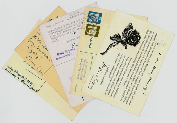 Zusammen 5 SS. 8vo. Dankt Josef Wesely für ihm wiederholt übersandte Geburtstagswünsche. - Zunächst Kunstmaler, war Eipper seit 1912 als Buchhändler in München und nach dem Ersten Weltkrieg als Privatsekretär von Samuel Fischer in dessen Verlag in Berlin tätig. In den folgenden Jahren publizierte er literarische und photographische Studien; 1928 veröffentlichte er das in der Tierliteratur längst zum Klassiker avancierte Buch "Tiere sehen dich an". Als freier Schriftsteller verfaßte er seit 1930 Tiergeschichten und Bildbände und war für Funk, Fernsehen und Film tätig. Vgl. Kosch IV, 71f. - Die Bildseiten zeigen den Schriftsteller als Brustbild, als Portrait im Halbprofil sowie unter dem Rüssel eines Elephanten.