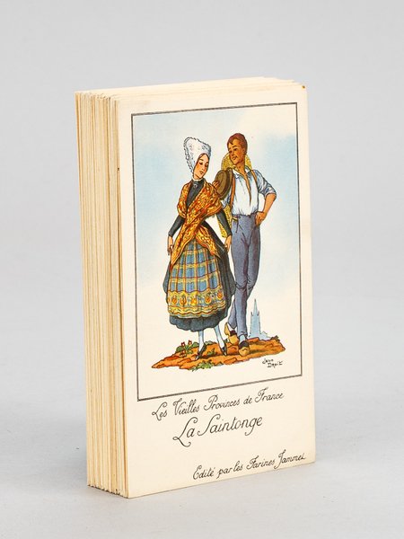 50 cartes en couleurs format 14 x 9 cm, Edité par les Farines Jammet, s.d. (circa 1950), 50 cartes illustrées sur le thème "Les Vieilles Provinces de France" illustrées en couleurs par Jean Droit : Comtat Vénaissin (3 exemplaires) - Nivernais - Normandie (2 ex.) - Orléanais - Picardie - Poitou - Roussillon - Saintonge (2 ex.) - Savoie - Flandre (2 ex.) - Franche-Comté (2 ex.) - Gascogne - Guyenne - Ile de France - Languedoc - Limousin - Béarn (6 ex.) - Artois (4 ex.) - Aunis (2 ex.) - Bourbonnais - Berry - Auvergne - Marche (2 ex.) - Bretagne - Touraine - Bourgogne - Anjou (2 ex.) - Dauphiné - Corse - Champagne - Lyonnais Bel ensemble réunissant 50 chromos en très bel état, représentant 31 couples en costume folklorique des diverses provinces de France. Prix de l'ensemble, non séparable Français