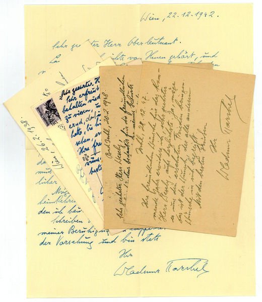 Zusammen 6 SS. 4to und 8vo. Mit 3 eh. adr. Kuverts. Dankt Josef Wesely für ihm übersandte Geburtstags- und Neujahrswünsche und sendet ebensolche: “Wie mag es Ihnen wohl gehen? Wo stehen Sie? Immer noch im Osten? [.]”. - Nach kurzer Tätigkeit im Staatsdienst lebte der als Sohn eines Offiziers geborene promovierte Jurist als freier Schriftsteller in Wien. "In den dreißiger Jahren schrieb er u. a. als Theaterkritiker für das 'Neue Wiener Tageblatt'. Politisch zu den 'nationalen' Autoren zählend, setzte er sich für den Nationalsozialismus und den 'Anschluß' Österreichs an das Deutsche Reich ein" (DBE). Vgl. auch Kosch VII, 393f.