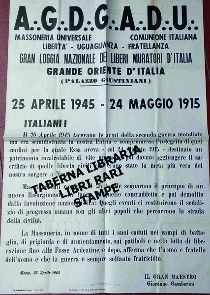 A.G.D.G.A.D.U. Massoneria Universale - Comunione Italiana - Libertà-Uguaglianza-Fratellanza. Gran loggia Nazionale dei Liberi M uratori d'Italia. Grande Oriente d'Italia (Palazzo Giustiniani). 25 aprile 1945-24 maggio 1915. Italiani! Il 25 aprile 1945 tacevano le armi della seconda guerra mondiale . ma il 25 aprile segnarono il principio di un nuovo Risorgimento La massoneria in nome di tutti i suoi caduti nei campi di battaglia, di prigionia e di annientamento sui patiboli e nella lotta di liberazione fino alle Fosse Ardeatine | Libri antichi e moderni | Gamberini Giordano Gran Maestro