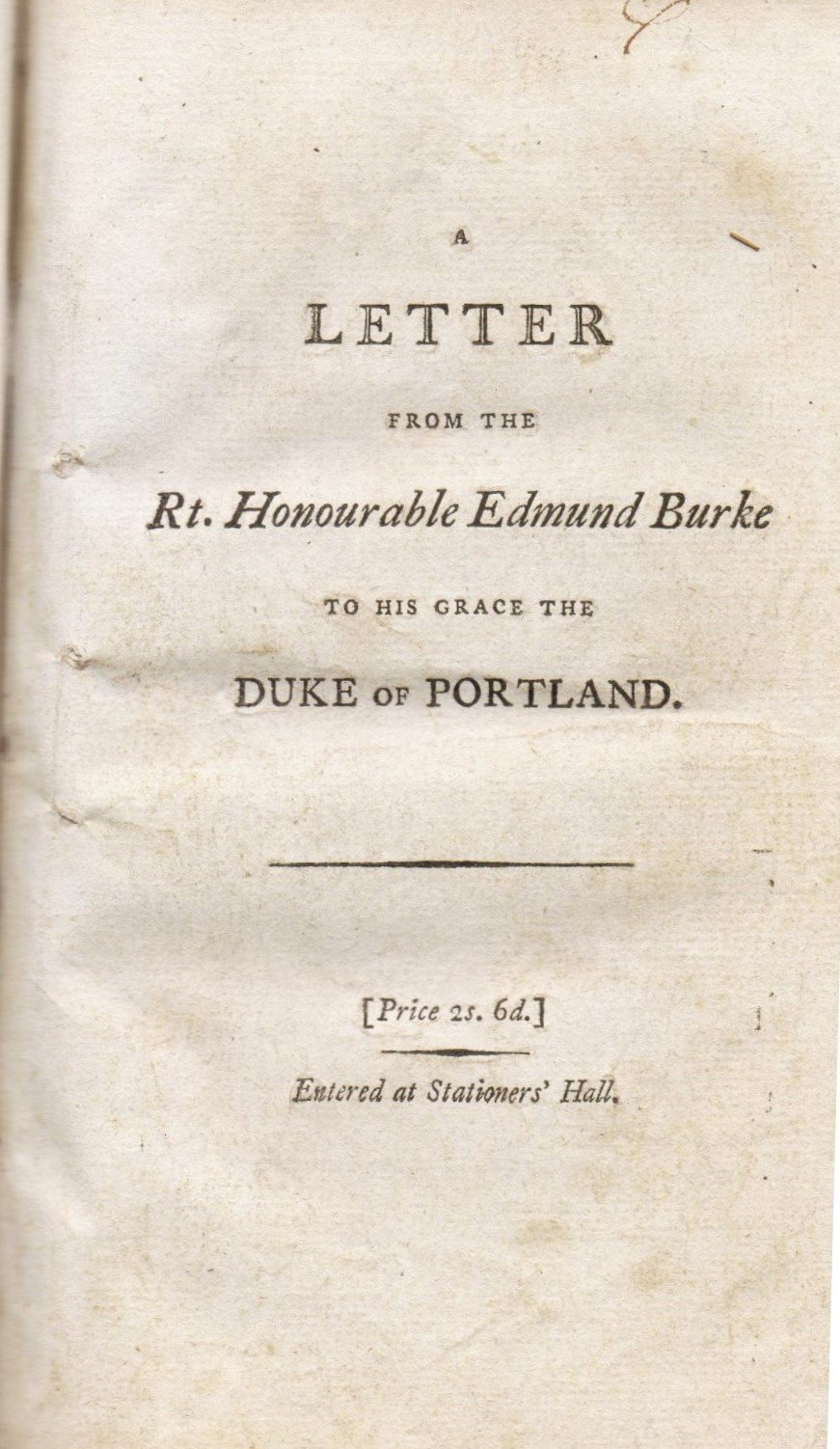 A Letter From The Rt. Honourable Edmund Burke to his grace the Duke of Portland on the Conduct of the Minority in Parliament. Containing fifty-four articles of empeachemnt against The Rt. Hon. C. F. Fox. From the original copy in the possession of the noble duke.