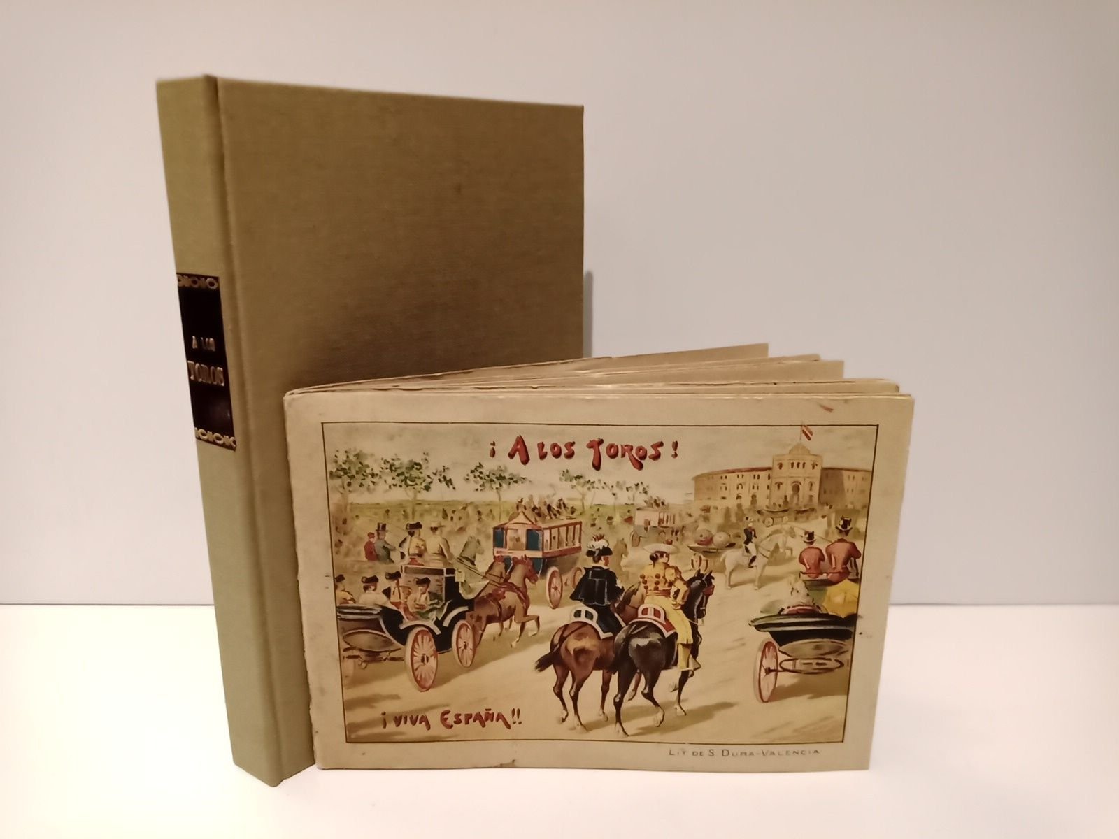Valencia: [s.n.], [ca. 1880].- Conjunto de 12 cromolitografías plegadas a todo color, grabadas por S. Durá sobre dibujos de Daniel Perea y Rojas (creemos), mostrando escenas sucesivas de una corrida de toros completa; 8º menor apaisado (10,7 x 15,2 cm); Protegidas en estuche de tela, tejuelo de piel.- RARO.* Mínima restauración en una de las dobleces. En general buen ejemplar. TAUROMAQUIA