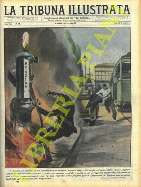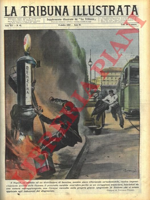 A Napoli, un addetto ad un distributore di benzina, mentre stava rifornendo un'automobile, veniva improvvisamente avvolto dalle fiamme. Il poveretto sarebbe senz'altro perito se un coraggioso tramviere, lanciatosi da una vettura sopraggiungente, non l'avesse ravvolto nella propria giacca spegnendo le fiamme che si erano appiccate agli indumenti del disgraziato. | Libri antichi e moderni | Pisani Vittorio