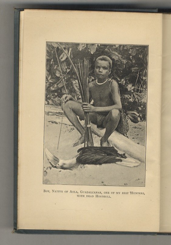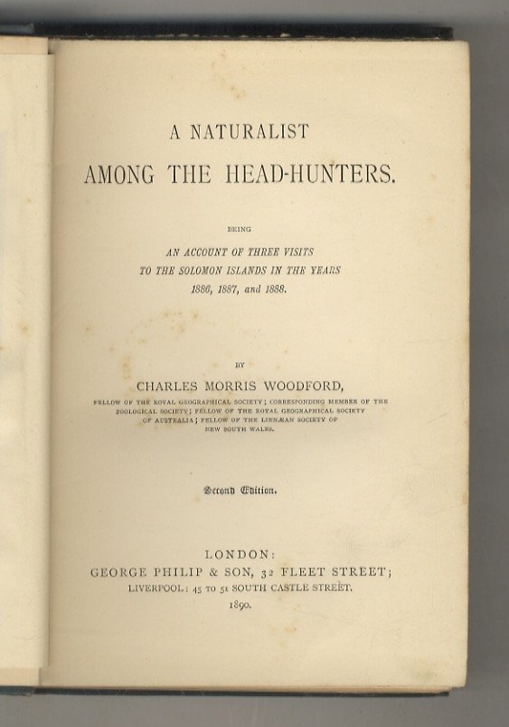 London, George Philip & Son, 1890, in-8, legatura editoriale in piena tela con figura impressa in oro al centro del piatto anteriore, titolo dorato con figura in nero sul dorso, pp. XII, 249, [11]. Con 16 tavole f.t. (antiporta compresa) con riproduzioni fotografiche protette da veline e 3 carte geografiche a colori ripiegate. Resoconto del primo contatto con la civiltà delle Isole Salomone e i suoi abitanti. Mancanza alla cuffia superiore del dorso, per il resto condizioni più che buone.