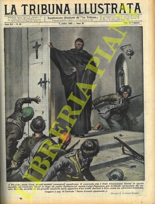 A Pe-ci-er, nella Cina, alcuni soldati comunisti assalivano il convento che i frati francescan hanno in quella località, ma venivano messi in fuga da padre Epifanio (al secolo Luigi Pegoraro) che, avvolto in un grande mantello nero, appariva d'un tratto davanti a loro, come un altissimo fantasma. | Libri antichi e moderni | Pisani Vittorio