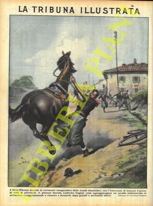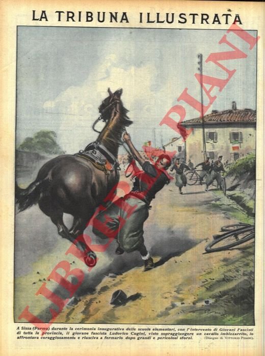A Sissa (Parma) durante la cerimonia inaugurativa delle scuole elementari, con l'intervento di Giovani Fascisti di tutta la provincia, il giovane fascista Ludovico Cugini, visto sopraggiungere un cavallo imbizzarrito, lo affrontava coraggiosamente e riusciva a fermarlo dopo grandi e pericolosi sforzi. | Libri antichi e moderni | Pisani Vittorio