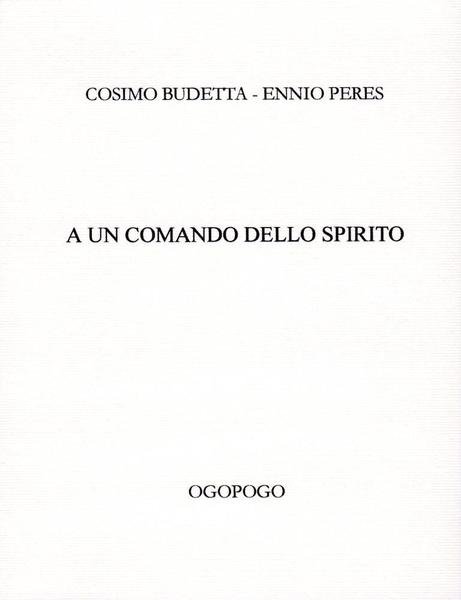 A un comando dello spirito, prima edizione luglio 2001, formato 14 x 18,5.<BR>Copertina morbida in cartoncino bianco con titoli in nero al piatto anteriore. Volume non rilegato. All'interno stampe a secco di Cosimo Budetta e poesie anagrammatiche di Ennio Peres.Edizione stampata in 80 esemplari numerati, nostra copia n. 27.<BR>Ottime condizioni.