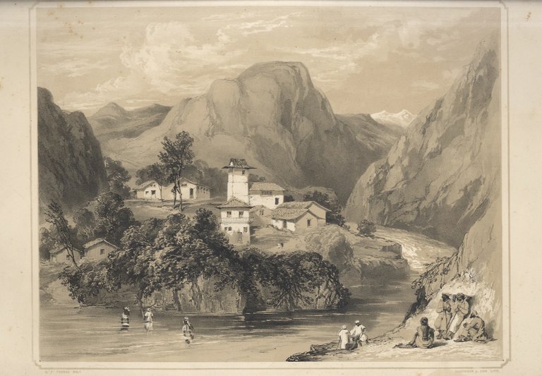 [London], Dickinson & Co., [1846], litografia in seppia, su carta, mm 280x365 (l'immagine), mm 370x548 (il foglio). Tavola dall'opera di George Powell Thomas, "Views of Simla", London, Dickinson & Co., 1846. Simla, fu una stazione montana in India,popolare ritiro estivo per i funzionari britannici durante l'era coloniale; nel 1864 fu dichiarata la capitale estiva dell'India Britannica. Mancanze e strappetti marginali.