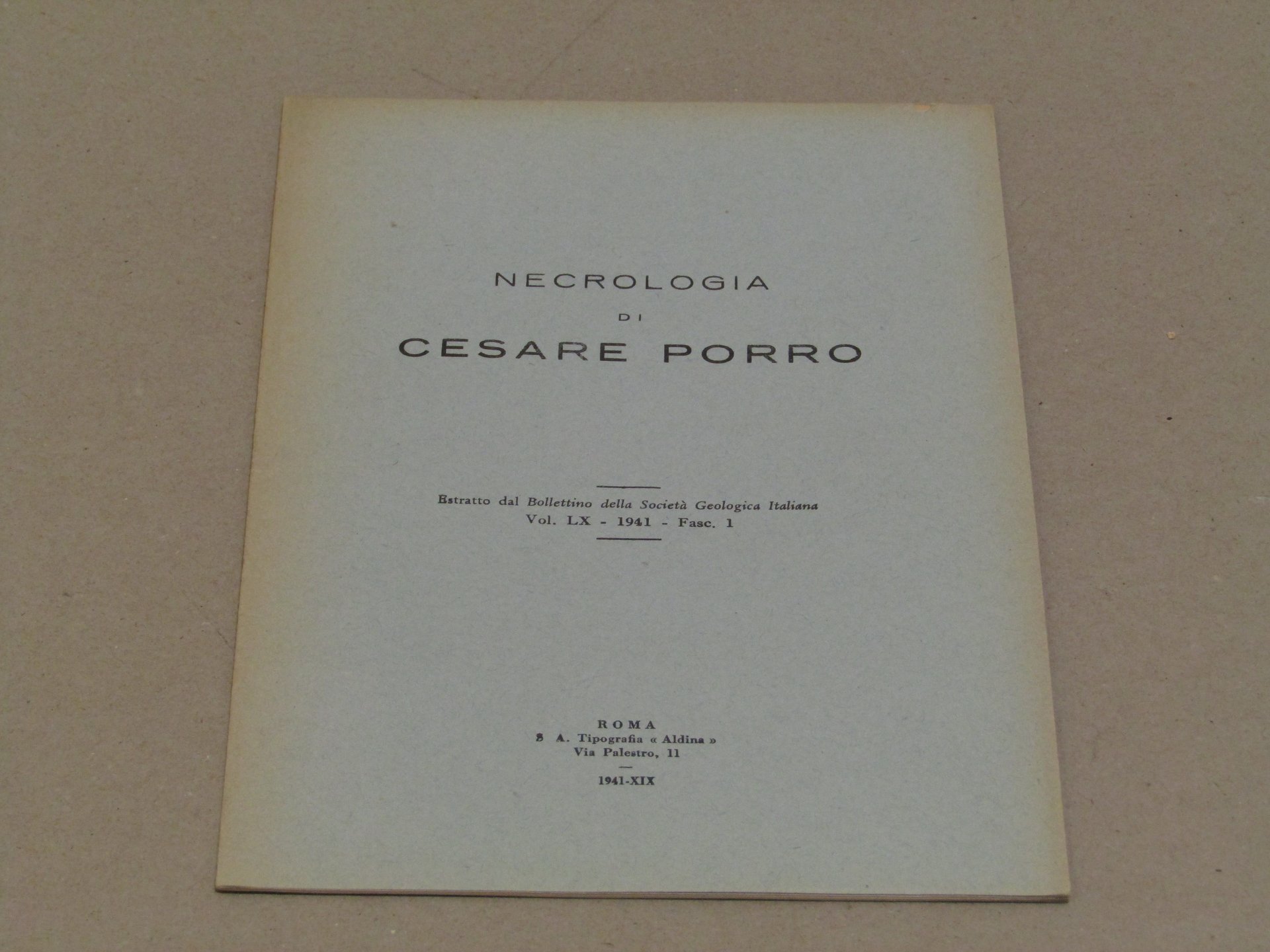 AA. VV. AA. VV. Necrologia di Cesare Porro. Roma, S. A. Tipografia Aldina 1941 - I italiano, in ottavo pp. non numerate Estratto dal Bollettino della Società Geologica Italiana. Copertina a punto metallico. Pagine ingiallite. Copertina ingiallita ai bordi.