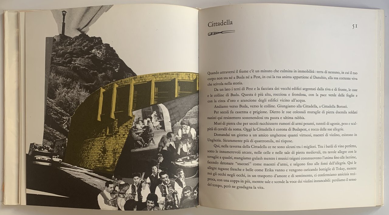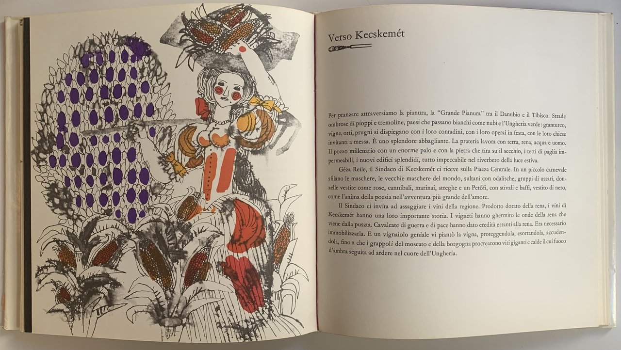 Prefazione-aperitivo di Ivan Boldizsar. Traduzione di Marinka Dallos e Jole Tognelli. A cura di Gianni Toti. Bellissime llustrazioni a colori di Liviusz Gyulai, Emma Heinzelmann, Kati Lorinczy, Mihaly Poharnok, Piroska Szanto, Endre Tot Bella copertina di Erika Urai. Cm 24,5x23,5. pp. 120. . Buono (Good). Sovracoperta sciupata. Fioriture nella parte superiore delle copertine in tela. Interni ottimi (Worn and chipped dust jacket. Yellowish stains at the top of the cloth covers. Interior very good ). Prima edizione italiana (First Italian Edition). . "I due scrittori venuti da lontano si ritennero in grado di fornire ai loro lettori in una nuova maniera notizie sull'Ungheria. Così percorsero questa terra per settimane intere, per conoscere la pianura dove cresce il grano, le colline inondate dal sole, dove sorgono le vigne e i dolci frutteti e le piantagioni verde acceso della paprika; le accoglienti osterie dall'ambiente familiare, i caffè fuori moda e i nuovi ristoranti. I cibi sono stati un pretesto per conoscere l'Ungheria. Quando mi comunicarono il progetto per questo libro domandai loro: "L'amate dunque tanto l'Ungheria?". Si guardarono reciprocamente come se ne avessero già parlato tra loro. "Amiamo tanto la vita", rispose Asturias. Io prego il lettore di tenere presente quaste parole al momento di mangiare il primo brodo oppure la prima polpa di zucchine (tokfozelek)" (dalla prefazione-aperitivo di Ivan Boldizsar).