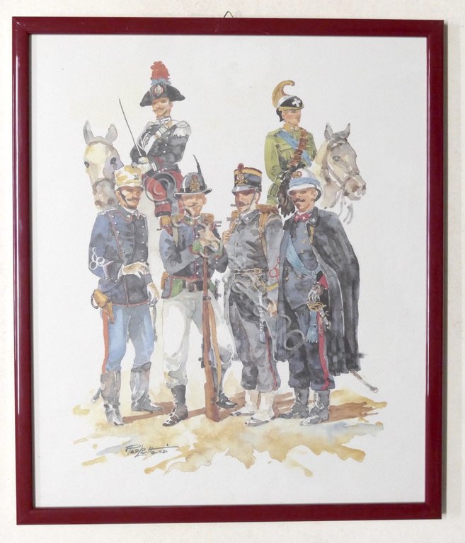Acquerello originale del pittore Paolo Lattanzi - Bozzetto per "Calendario E I 1996 " dello Stato Maggiore dell'Esercito Italiano Da sinistra verso destra: - Fanteria di Linea, Sottotenente in uniforme di marcia (1892) - Carabiniere Reale a cavallo (1875) - Alpino in tenuta di servizio estiva (1883) - Sergente della Compagnia Deposito Zappatori del Genio in uniforme di marcia (1899) - Tenente del Genova Cavalleria in grande uniforme (1923) - Bersagliere Ufficiale in uniforme di marcia Corpo di Spedizione in Cina (1901) Dimensioni: 32 x 39 cm ca. Elegante cornice laccata Condizioni generali molto buone. Paolo Lattanzi, acquarellista, incisore è nato a Roma il 25 gennaio 1949. Opera da anni tra Roma e Tarquinia. Il debutto nel mondo artistico avviene nel 1971 e attualmente può contare su un considerevole numero di mostre personali e di collettive e rassegne nazionali ed internazionali. Affianca all’acquarello la tecnica dell’incisione. Sue opere figurano in collezioni di Enti Pubblici.