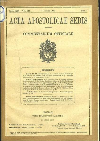 ACTA APOSTOLICAE SEDIS. COMMENTARIUM OFFICIALE. ANNUS XIX, VOL XIX. 1927. (N°1 à 14).