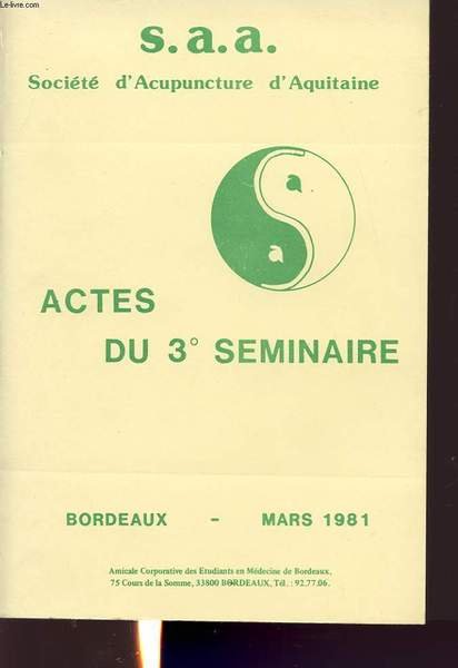 ACTES DU 3� SEMINAIRE BORDEAUX : Le choix des points en alg�sie acupuncturale, tentative de simplification de l �tude des pouls, endocrinologie sexologie et acupuncture, depression et agitation : quelques aper�u nosologiques et th�rapeutiques en medecine. | Libri antichi e moderni | Societe D Acupuncture D Aquitaine