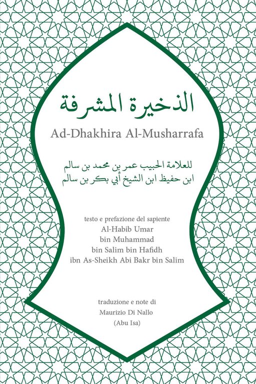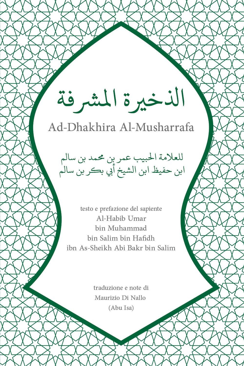 Le basi della comprensione della religione sono le fondamenta per costruire il nostro avvicinamento al Signore dei mondi, accaparrarsi il Suo compiacimento e permanere in eterno nei suoi Paradisi. Esse sono agevolate, a portata di mano, facilitate, di valore immenso e le loro luci risplendono. In "Ad-Dhakhira Al-Musharrafa" vi è un chiarimento e un'agevolazione di quelle solide fondamenta, tra i fondamenti della fede e le basi della purificazione, preghiera rituale, buone etichette e ricordo del Signore dei mondi. Prefazione del sapiente Al-Habib Umar bin Muhammad bin Salim.