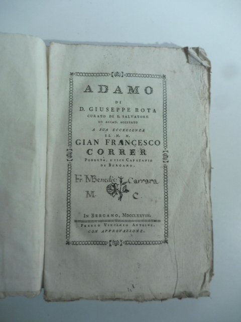 Adamo. A sua eccellenza il N. H. Gian Francesco Correr podesta' e vice capitanio di Bergamo | Libri antichi e moderni | Giuseppe Rota