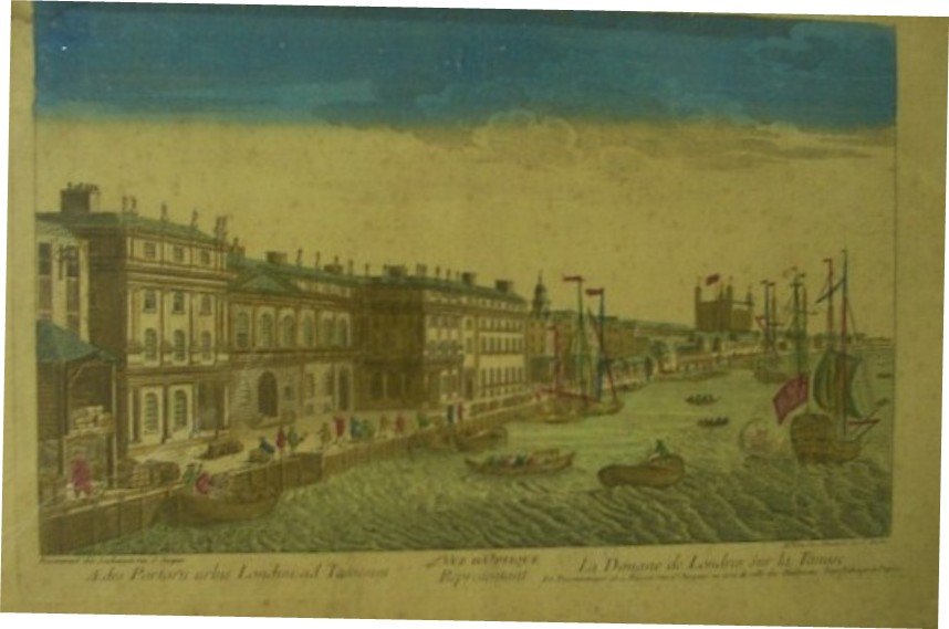 Stampa a colori di cm. 29,5 x 52,5 ca., raffigurante alcuni palazzi, una parte di porto sul Tamigi, alcune barche agli ormeggi o in fase di attracco e diversi personaggi in costumi d'epoca. La stampa è già montata su cornice moderna.