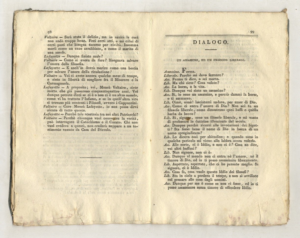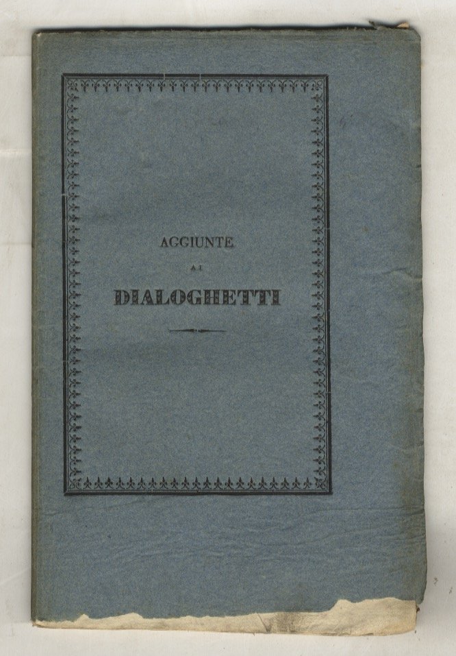 [S.l.], [s.n.t.], [1832], in-8, brossura editoriale con titolo inquadrato da cornice tipografica sulla copertina anteriore, pp. [2], numerate da 89 a 124. In fine: 19 febbraio 1832. Fascicolo edito singolarmente ma che andava unito alla sesta edizione dei Dialoghetti.