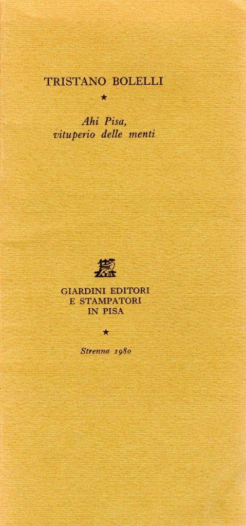 Ahi Pisa, vituperio delle menti, prima edizione novembre 1979, pp. 24, formato 9,5 x 20.<BR>Copertina morbida di colore verde con titoli in nero al piatto anteriore.Volumetto stampato in 500 copie numerate con caratteri Imprint. Nostra copia n. 304.<BR>Ottime condizioni.