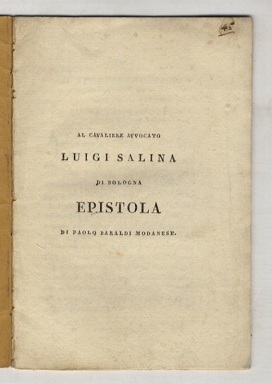 Al cavaliere Luigi Salina di Bologna. Epistola. | Libri antichi e moderni | Baraldi Paolo.