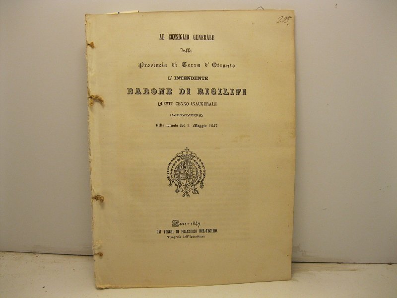 Al consiglio generale della Provincia di Terra d'Otranto l'intendente Barone di Rigilifi questo cenno inaugurale leggeva nella tornata del 1 maggio 1847 | Libri antichi e moderni | Landolina Pietro, Barone Di Rigilifi