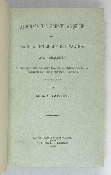 Large 8vo. XVII, (3), 113, (3), 407, (1) pp. With 3 lithographed plates. Contemporary red cloth with giltstamped spine title; original blue wrappers bound within. First modern edition of the original Arabic text of "Al Hidayah ila Faraid al-Qulub" ("Guide to the Duties of the Heart"), written in 1080 by the Jewish philosopher Bahya ibn Paquda, who lived at Zaragoza, in Muslim Spain. The work offers the first Jewish system of ethics and was translated into Hebrew by Judah ibn Tibbon in 1161-80 ("Chovot ha-Levavot"). It is based on numerous non-Jewish sources, including writings of Islamic mysticism and Arabic neo-Platonism. Yahuda's edition uses mss. in the libraries of Oxford, Paris, and St Petersburg. - In excellent condition. - Herlitz IV/2, 1521. OCLC 3117215.