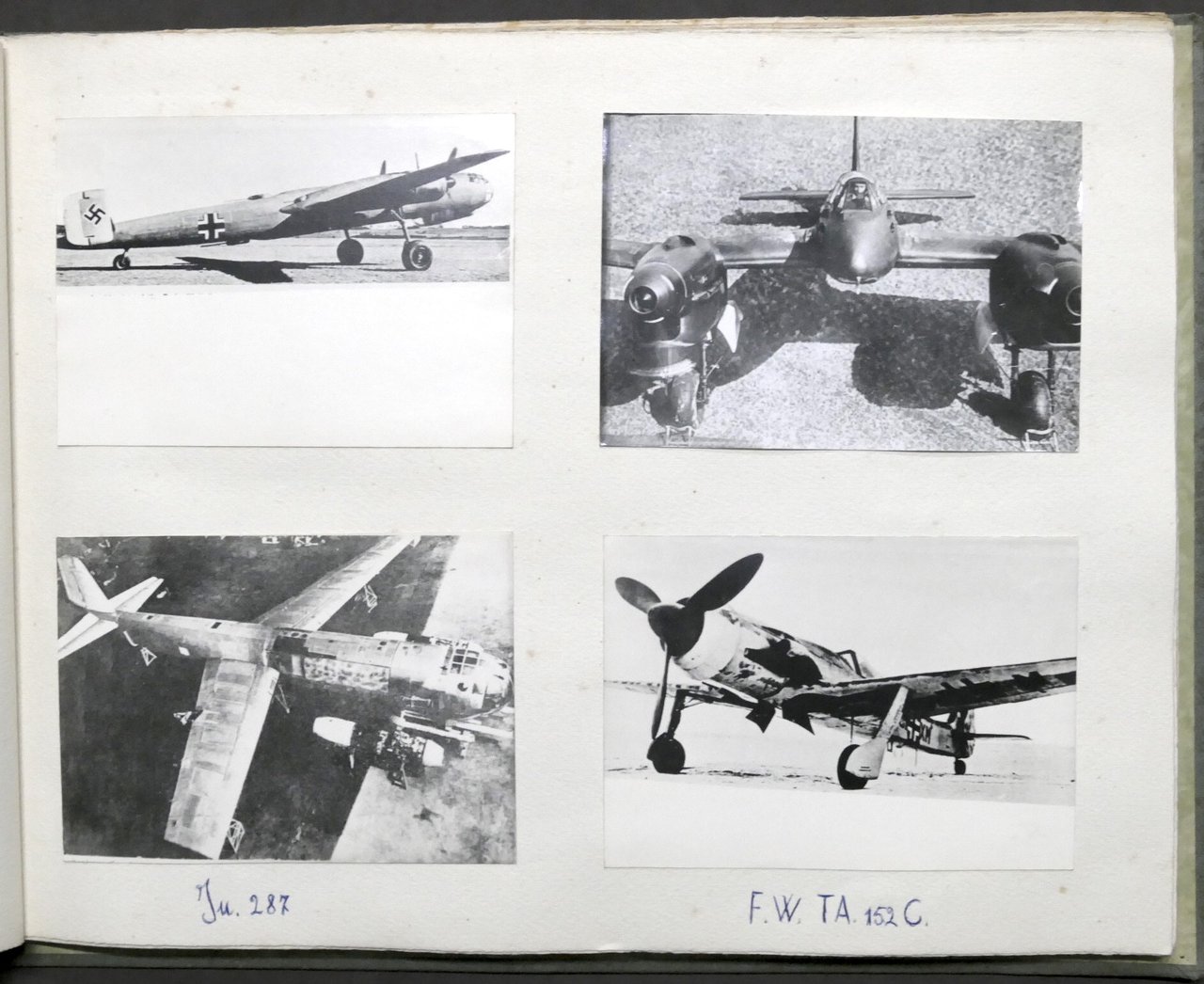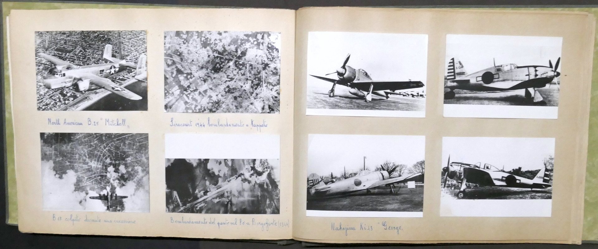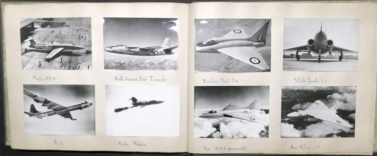 Album Aeronautica - Periodo: seconda guerra mondiale e anni '50 191 riproduzioni fotografiche di fotografie prese da riviste, stampe, giornali e libri che mostrano aerei, caccia militari, velivoli sperimentali appartenenti a Luftwaffe, USAAF, Aeronautica Giapponese; alcune azioni di bombardamento e missioni di Kamikaze. Dimensioni foto: 10 x 15 cm ca. Didascalie manoscritte. Copertina rigida - Dimensioni album: 31 x 42 x 2 cm ca. Condizioni generali molto buone. Strappi alle ultime tre fotografie.