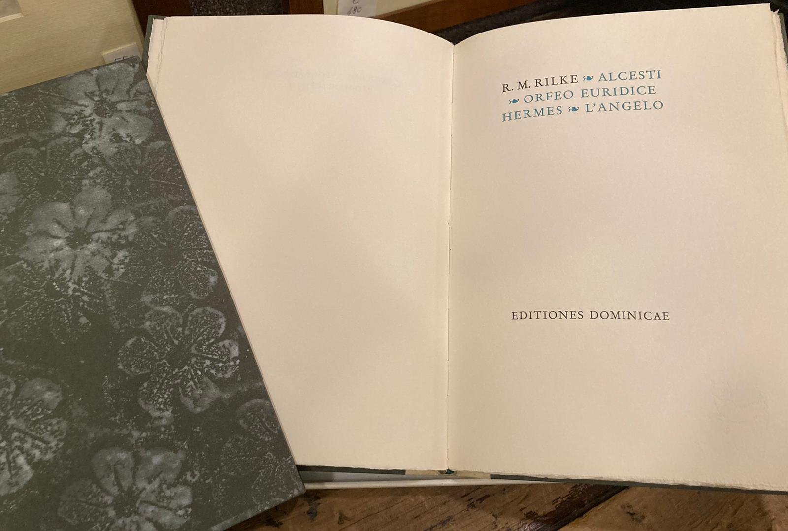 In-8° pp. 30. Legatura editoriale in mezza pergamena con titolo in oro al dorso, astuccio. Perfetto stato. Raffinatissima edizione di Franco Riva: 3 poesie di R. M. Rilke nella versione di Giaime Pintor, composte e stampate a mano, in soli 30 esemplari (il nostro nr. 7).