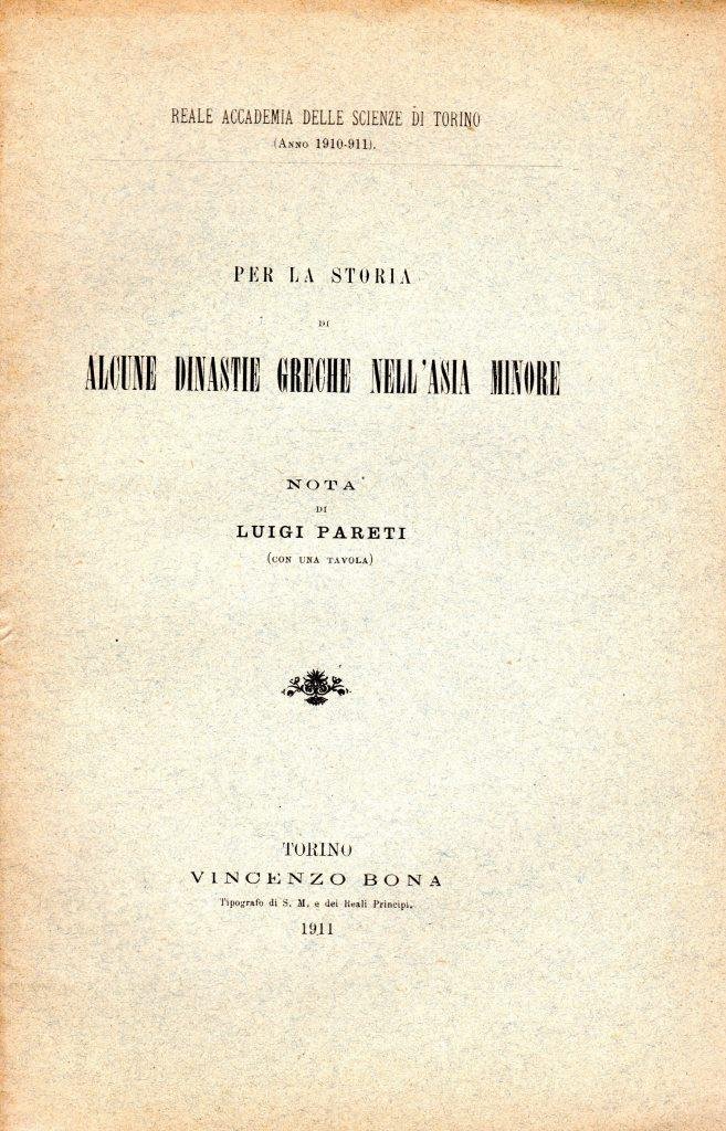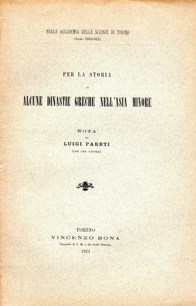 Alcune dinastie greche nell'Asia Minore, prima edizione 1911, pp. 16, formato 16 x 25.<BR>Copertina morbida di colore verde con titoli in nero al piatto anteriore. All'interno una nota di Luigi Pareti. Volume intonso. <BR>Ottime condizioni.
