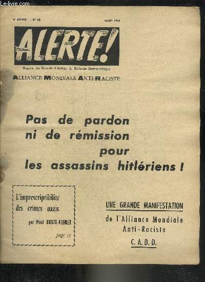 ALERTE N�38 4E ANNEE MARS 1965 -Les crimes nazis contre l'humanit� sont imprescriptibles � jamais - l'unanimit� de la France - le r�seau d'�vasion des criminels nazis - les falsificateurs de l'histoire par Philippe Dechartre - le mein kampf du Ra�ss etc.