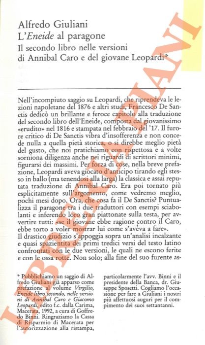 Alfredo Giuliani. L'Eneide al paragone. Il secondo libro nelle versioni di Annibal Caro e del giovane Leopardi. Fausto Curi. Per i settant'anni di Alfredo Giuliani.