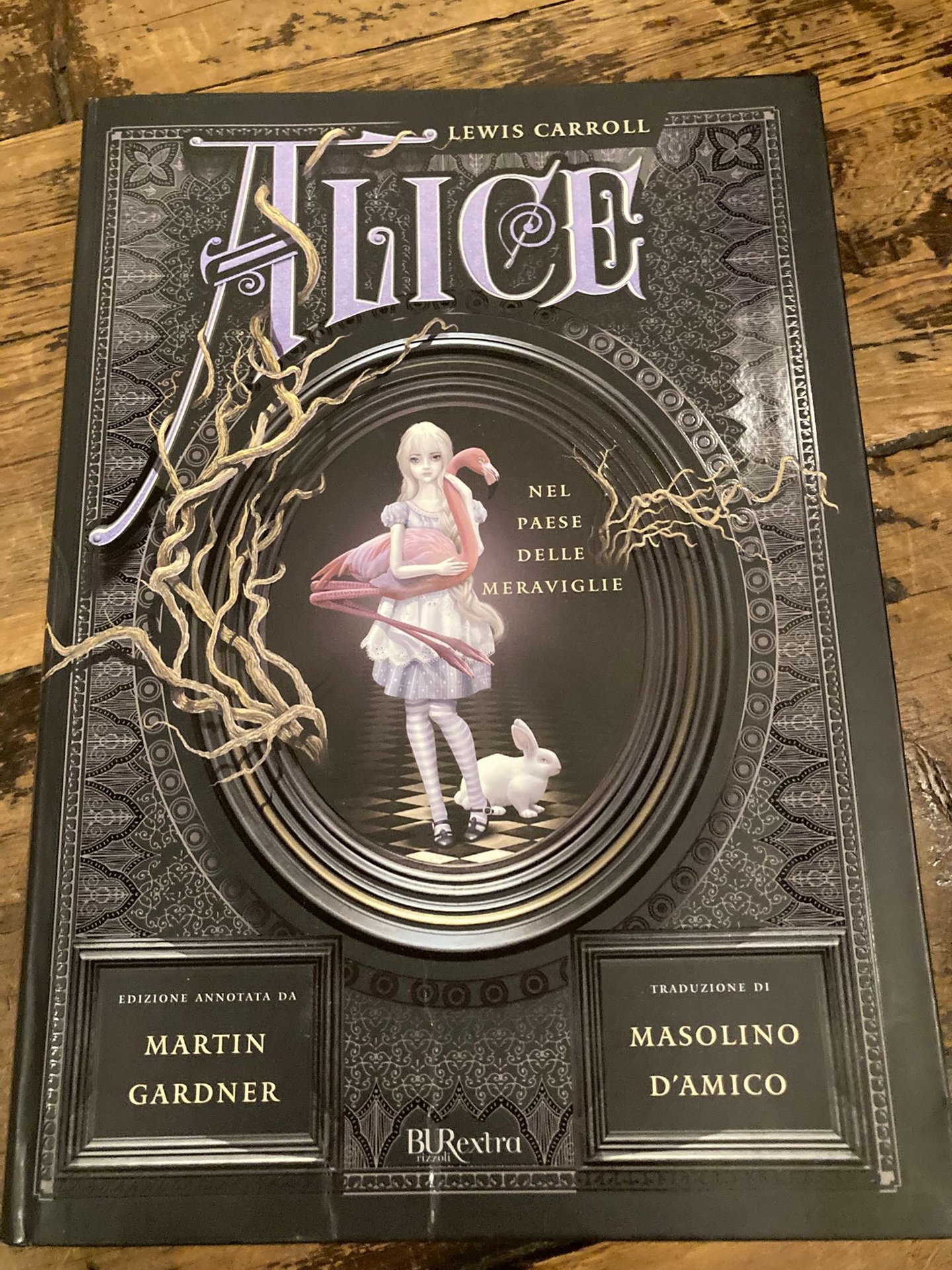 In-4° (32x24 cm), pp. 354, (6), cartonatura flessibile figurata a colori editoriale, contropiatti e sguardie figurate (progetto grafico di Iacopo Bruno). Figure b/n nel testo e fuori di esso. Minime increspature al piede dei piatti ma ottimo esemplare. Non comune prima edizione italiana in questa collana della classica edizione annotata inglese di Alice (1960, 1990). Le annotazioni sono riportate al margine laterale esterno del testo.