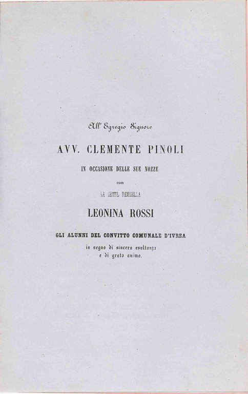 All'Egregio Signore Avv. Clemente Pinoli in occasione delle sue nozze con la gentil damigella Leonina Rossi.