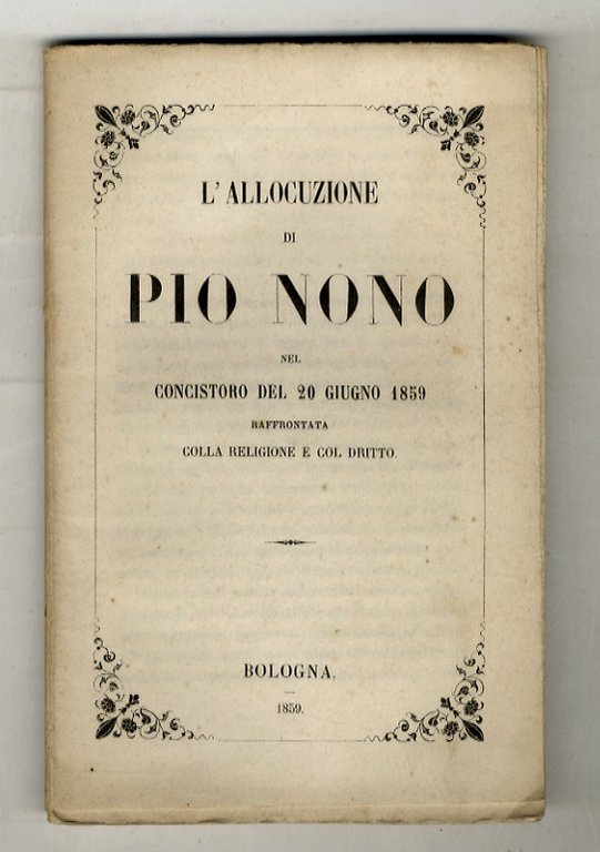 ALLOCUZIONE (L') di Pio nono nel concistoro del 20 giugno 1859 raffrontata colla religione e col dritto [sic].