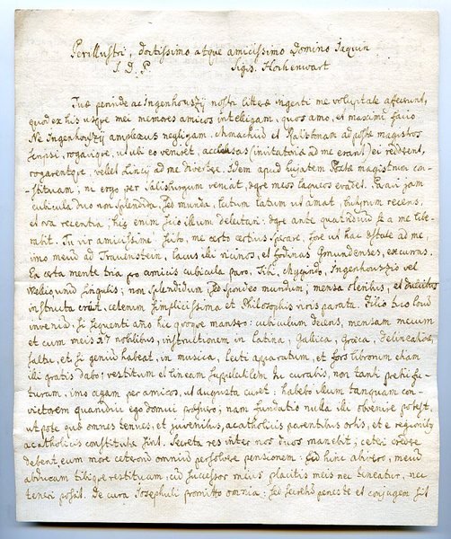 4to. 3¼ pp. In Latin. To his friend, the botanist Nikolaus Joseph von Jacquin (1727-1817), since 1769 professor of chemistry and botany at the University of Vienna, and also director of the Botanical Garden of the University of Vienna (later the imperial gardens of Schloss Schonbrunn): "Tuo perinde ac Ingenhouzii nostri litterae ingenti me voluptate affecerunt, quod ex his usque mei memores amicos intelligam, quos amo, et maximi facio. Ne Ingenhouzii amplexus negligam [.] Ni tam juvenis filiolus esset, post pascha illum acciperem. Gaudeo expeti nova Horti Vind. exemplaria Londinum; hic ingens nox in rebus hisce est: neque otium adhuc fuit visendi Abbates, qui sane plurimum impendunt in Bibliothecas [.] An Khellius jam persolvit exemplar? [.] Nescio an P. Boda gratulari debeam? Puto non multo faventiores res inventurum Gmundae. Quid Hellius? [.] Gaudeo Dispensatorium Viennense a tantis viris compositum [?] et opto ut omnibus numen valitudinem firmet ad perficiendum: meritis B. Swieten de re medica nostrate maxime hoc unum deesse videbatur. Curate ne mixtura Hoffmaniana, aqua Boraginis, Magnesia, decoctum Cichorii emaneat [.]".
