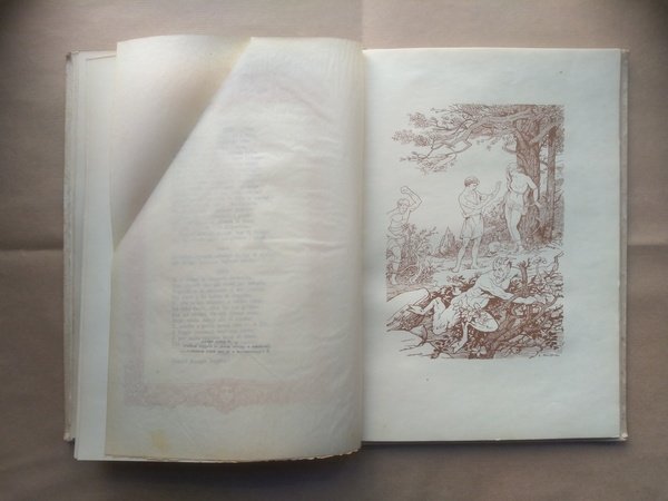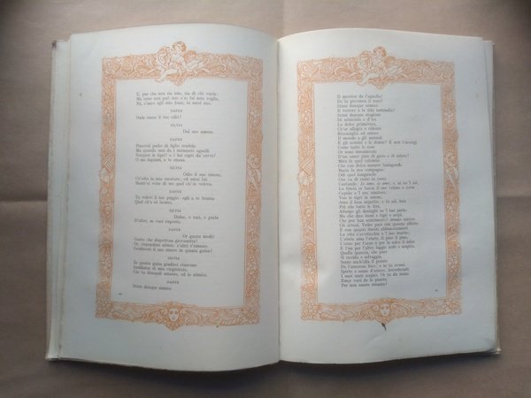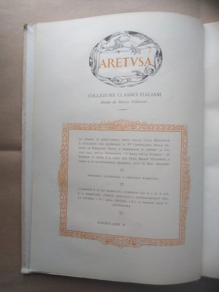 Un volume in 4to (24x34 cm) di 94 pagine inquadrate dai fregi di Anichini e con 5 illustrazioni a piena pagina (protette da velina) dello stesso Anichini; ritratto di Tasso applicato in antiporta. Legatura in tela con copertina ornata incollata ai piatti: purtroppo della sporcizia e una gora ai lati della copertina danno un mediocre aspetto esterno al volume (L'interno è invece in ottime condizioni). Edizione di 500 copie numerate (questa 020), a cura di Mario Villoresi. Ezio Anichini (1886-1948) è stato uno dei più influenti illustratori italiani nello stile dell'art nouveau, e la sua opera per questo libro è di notevole raffinatezza.