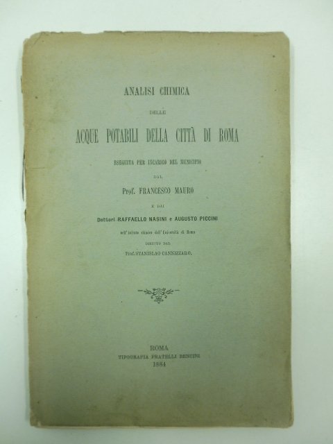 Analisi chimica delle acque potabili della citta' di Roma eseguita per incarico del Municipio dal Prof. Francesco Mauro e dai Dottori Raffaello Nasini e Augusto Piccini nell'istituto chimico dell'Universita' di Roma diretto dal Prof. Stanislao Cannizzaro | Libri antichi e moderni |