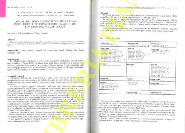 Analisi del popolamento ittico della zona infralitorale dell'oasi di Torre Guaceto (BR) con l'uso del "Visual Census". | Libri antichi e moderni | Marconato A. - Mazzoldi C. - De Girolamo M. - Stefanni S.