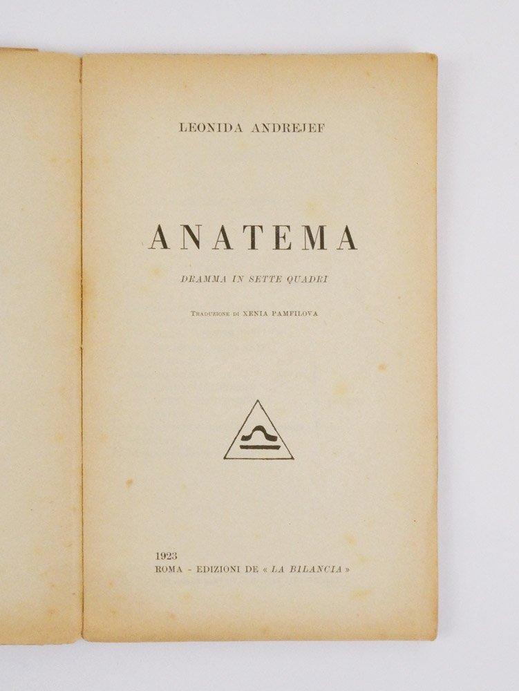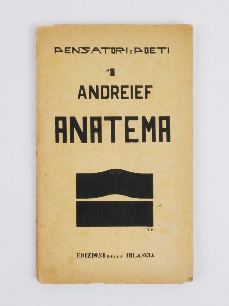 LIBRO Prima edizione italiana. Esemplare ancora conservato nella brossura originale, in più che buone condizioni (dorso lacunoso e piccole mancanze ai bordi, poco influenti). Non comune prima edizione italiana nella raffinata collezione diretta da Umberto Barbaro e curata graficamente da Paladini, emanazione dell’omonima rivista. «Anatema» è una delle opere del periodo simbolista del drammaturgo russo Leonid Andreev (1871-1919).