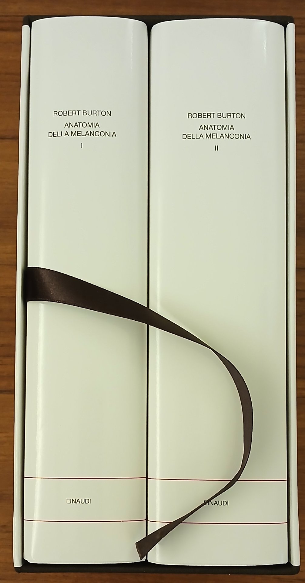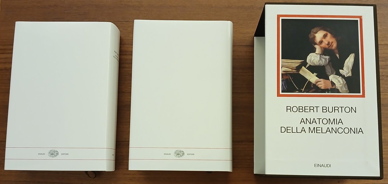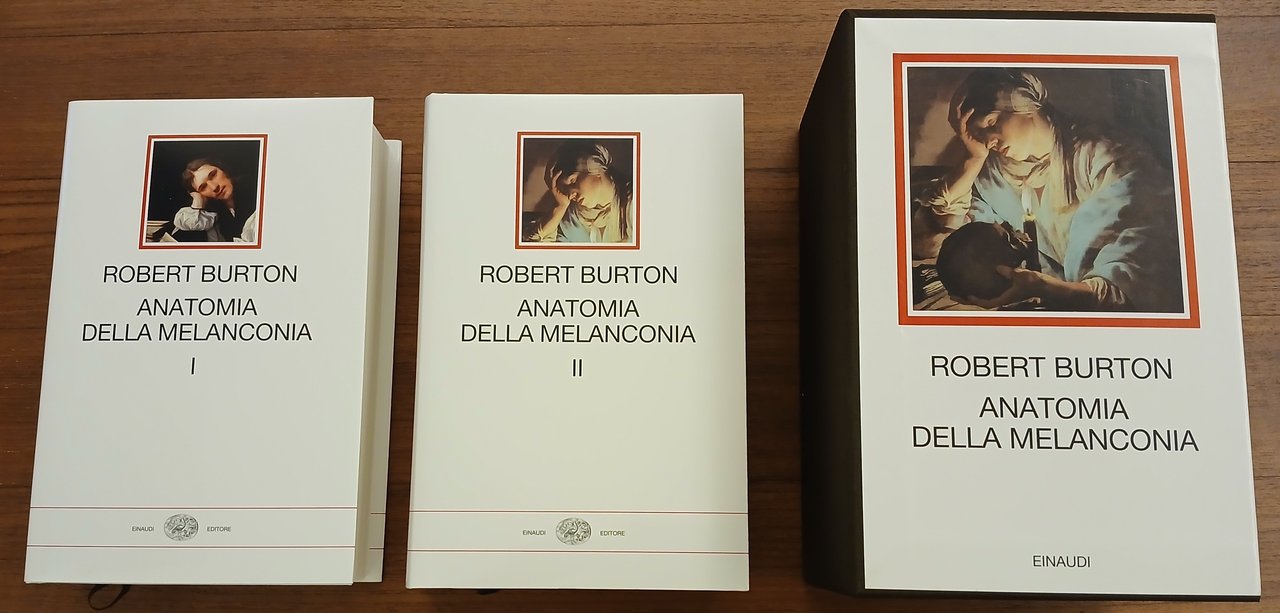 Collana "I millenni", Due volumi in 8°, legature editoriali in piena tela, sovraccoperte e custodia rigida illustrate a colori, pp. complessive CCLVI + XII,1867,(1), con 26 tavole in nero ed a colori fuori testo. Titolo originale "The Anatomy of Melancholy". A cura di Stefania D'Agata D'Ottavi. Volumi e custodia allo stato di nuovo, mai sfogliati.